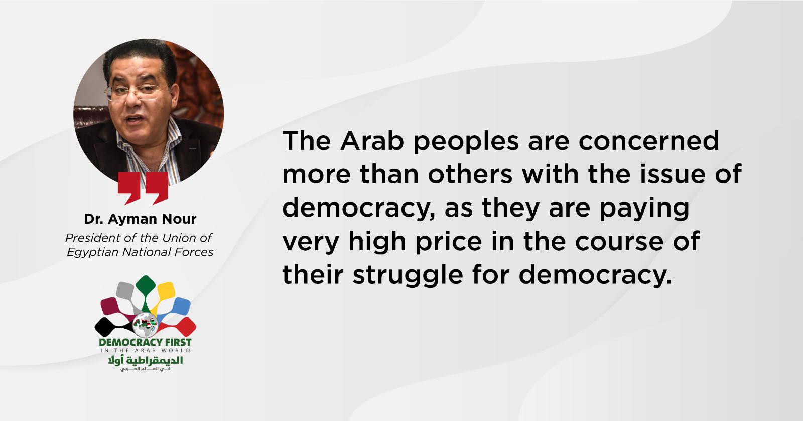 بدوره ألقى الدكتور أيمن نور، رئيس التحالف الوطني المصري، قرأتها الدكتورة سامية هاريس، نقل فيها إلى الرئيس بايدن أنه "لا يمكن أن تكون هناك إصلاحات بدون إصلاحيين، ولا ديمقراطية بدون ديمقراطيين". وأشار إلى عدم وجود تمثيل مناسب لـ400 مليون عربي في قمة الديمقراطية رغم الثمن الباهظ الذي دفعوه لكسب الديمقراطية. ودعا نور إلى حوار بناء بين الدول الديمقراطية الراسخة في الولايات المتحدة وأوروبا والإصلاحيين المؤيدين للديمقراطية في الدول العربية لرسم طريق نحو الديمقراطية في مصر والشرق الأوسط.
